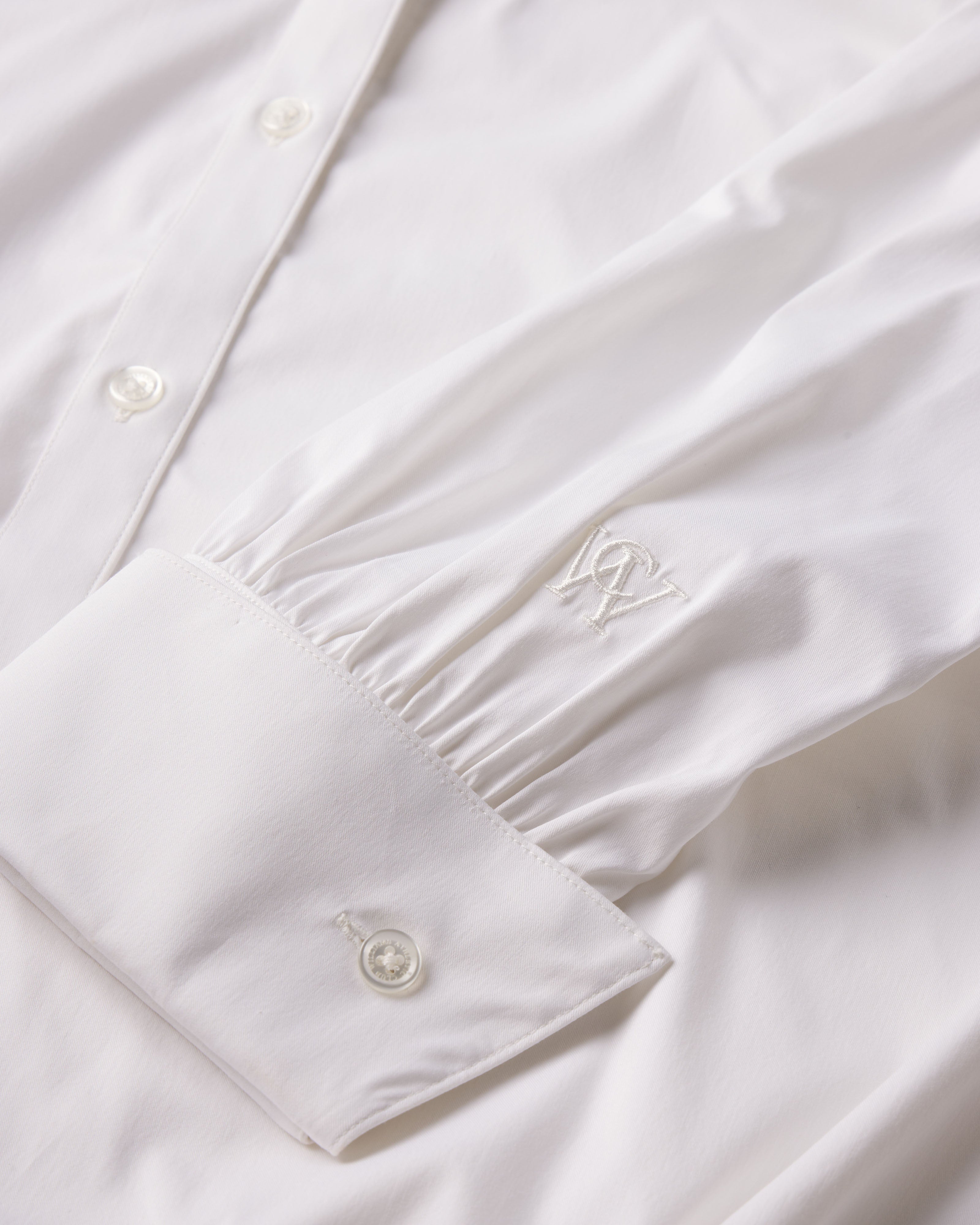 - Long sleeves intentionally cut longer to cinch and ruche at the arm