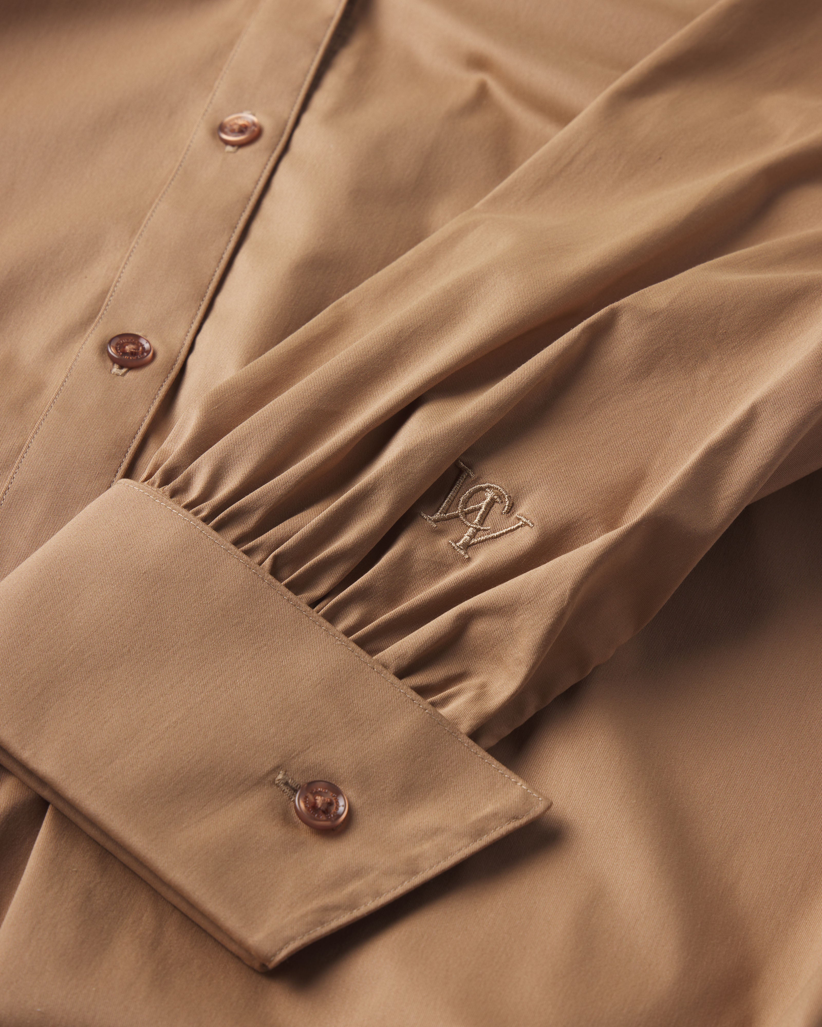- Long sleeves intentionally cut longer to cinch and ruche at the arm