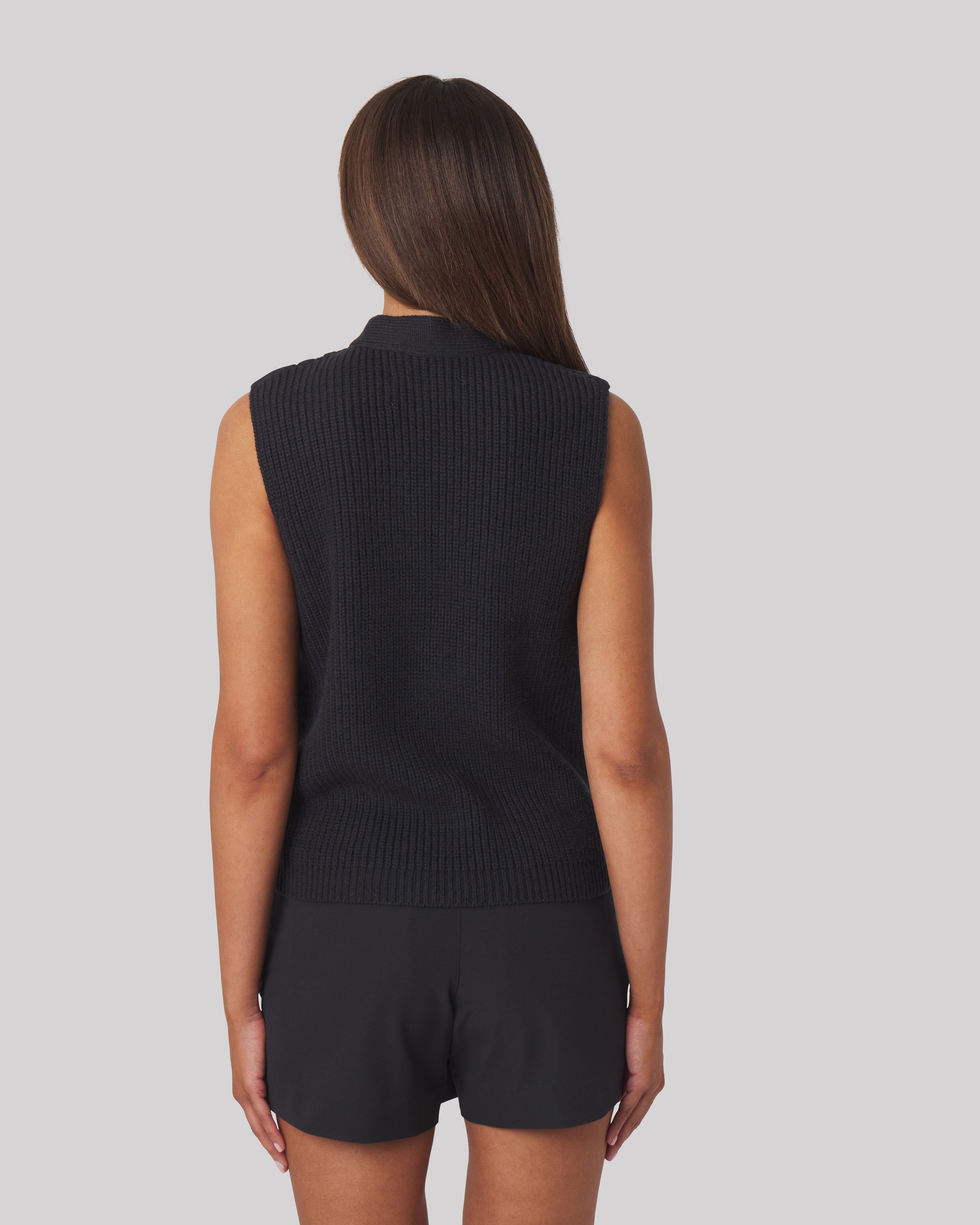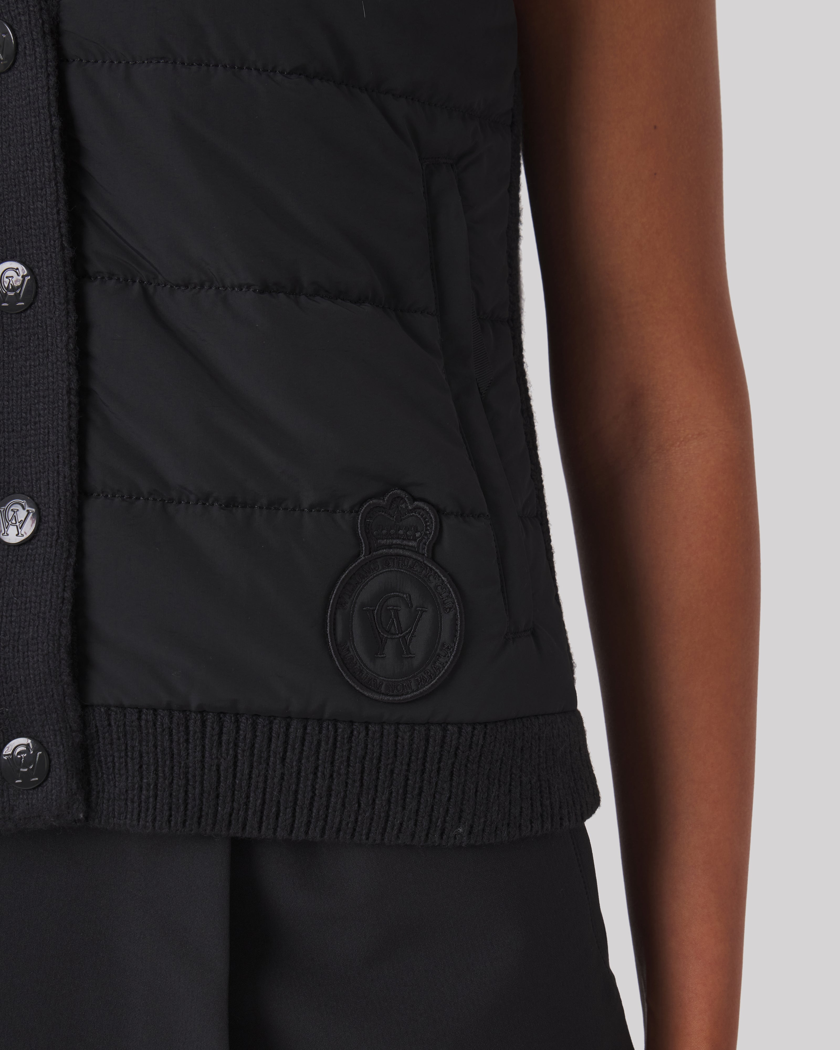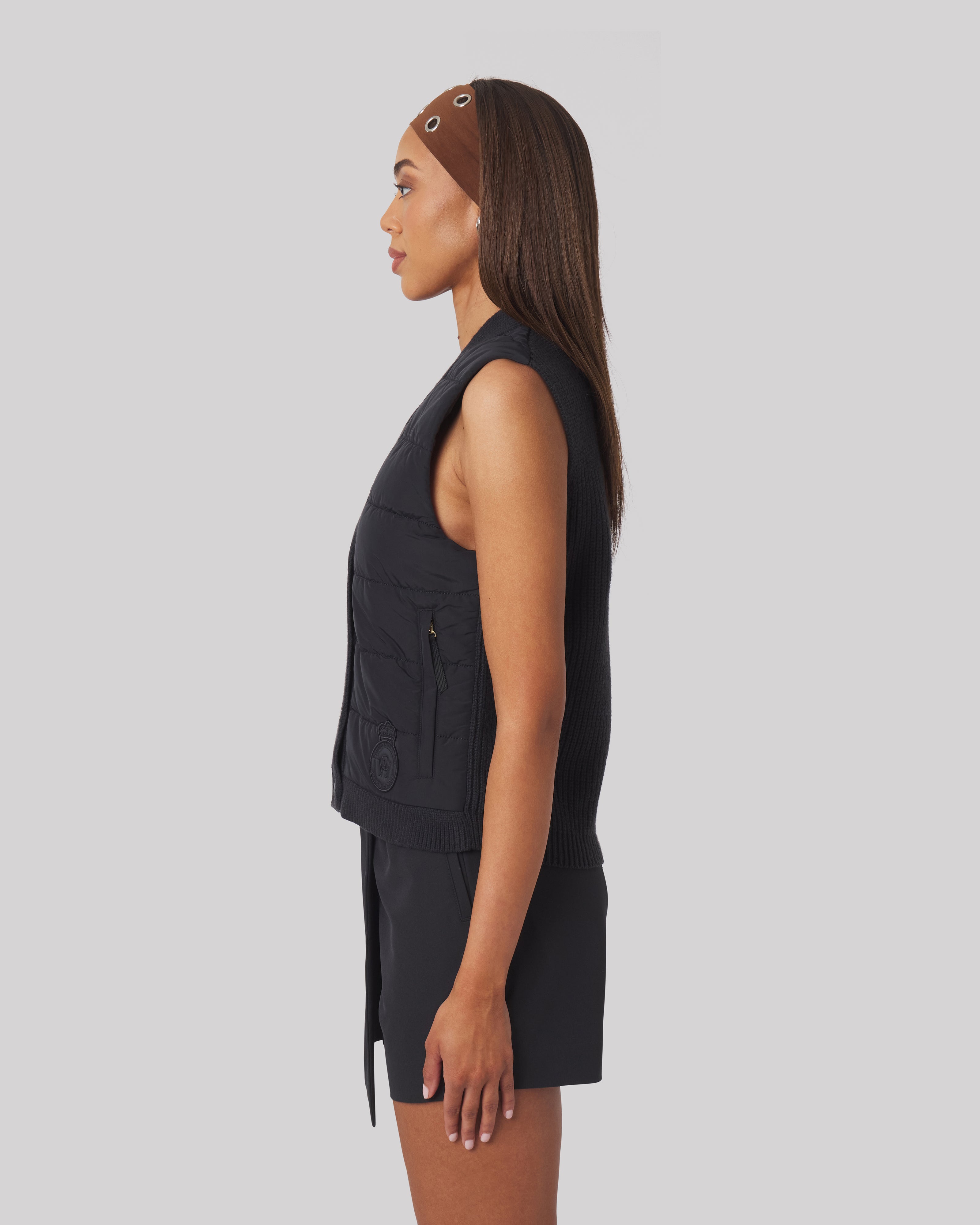 The Hailee Vest is a modern twist on a classic, designed with a lightweight, sustainable fill for warmth without bulk and a water-repellent shell for light weather protection. A contrast knit back adds texture and flexibility, while branded snaps and secure pockets deliver subtle detailing and function. Perfect for layering on the course, in transit, or around town.