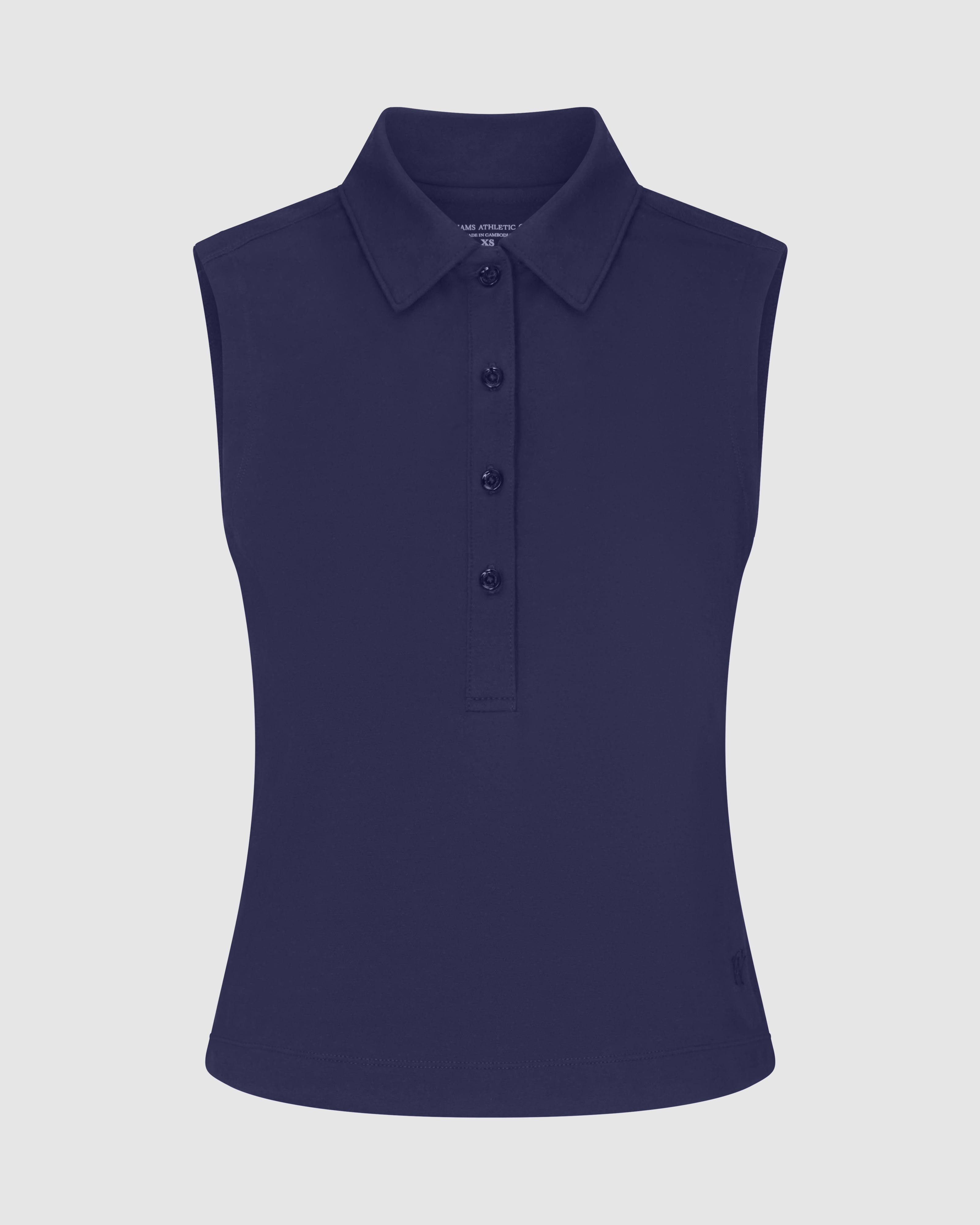 A self collar and five pearl buttons elevate the silhouette, while the sleeveless cut allows for ease of movement and a clean, modern look. Polished yet practical, the Maggie Polo transitions seamlessly from the course to everyday wear.