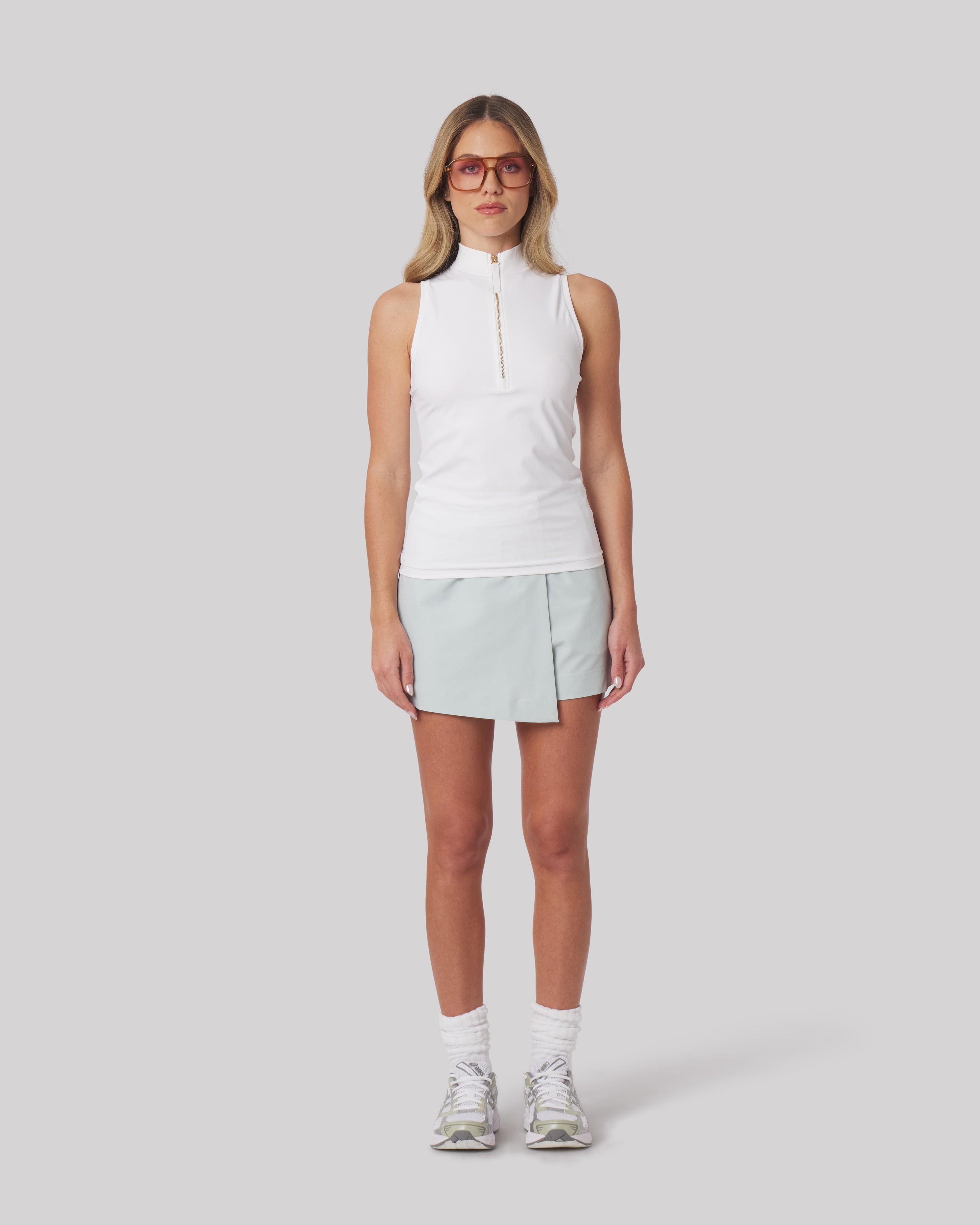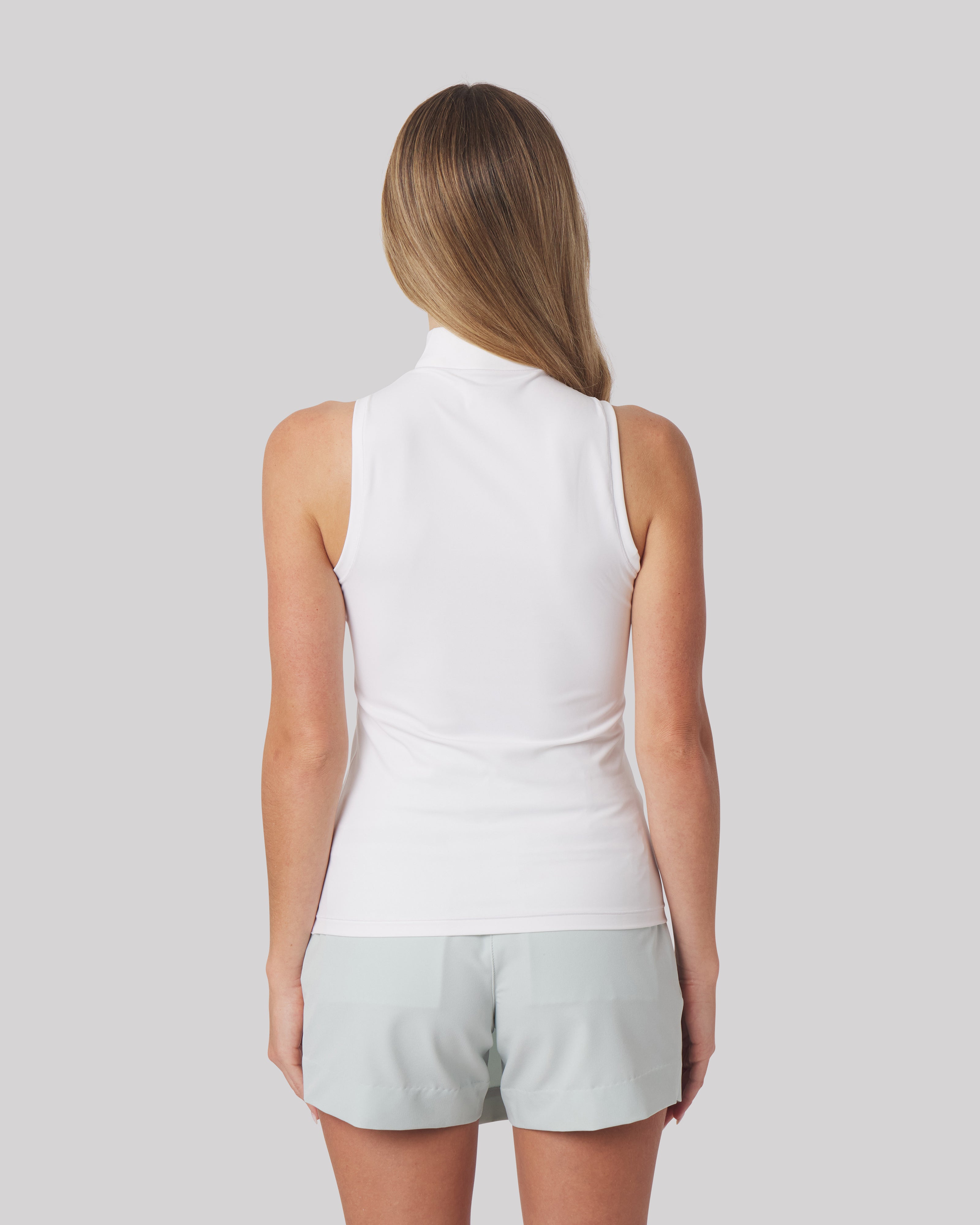 Designed with a refined stand collar, gold zipper detailing, and built-in UPF protection, the Tabitha brings elevated polish to any active or off-duty moment. A flattering, versatile staple that pairs effortlessly with trousers, skirts, or layered under outerwear.